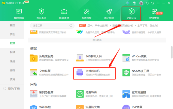 2、首先打开360安全卫士,接着在上面的选项中点击“功能大全”,然后在下面的列表中找到“文件粉碎机”并点击,点击后和上面的步骤一样,将需要进行删除的文件粉碎就可以了。