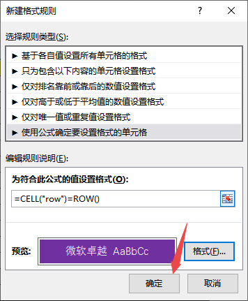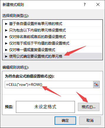 3、接着,软件就会弹出新建格式规则的窗口了,此时我们在窗口上方的【选项规则类型】中,选项【使用公式确定要设置格式的单元格】选项,然后在【为符合此公式的值设置格式】下方的输入框中,输入【=CELL("row")=ROW()】公式,然后点击【预览】右侧的【格式】按钮。