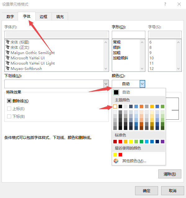 4、然后在弹出的设置单元格格式窗口中,在字体颜色的选项位置上,将字体的颜色选择为【白色】。