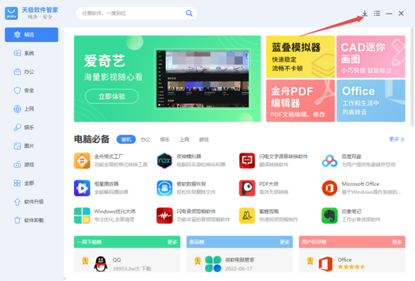 1、首先,启动电脑PC端天极软件管家,然后点击界面顶部右上角的【下载】按钮。