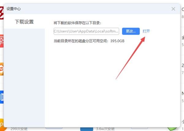 3、接着,软件就会弹出设置中心窗口了,此时在这个窗口中,我们可以看到天极软件管家所下载软件的保存路径了,点击保存路径右侧的【打开】选项,我们就可以进行到下载软件的保存目录当中,接着我们就可以对下载好的软件包进行删除了。