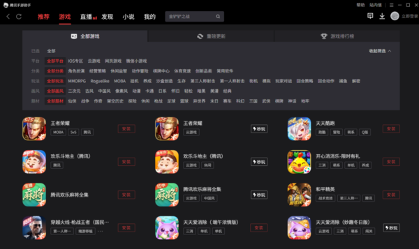 腾讯手游助手启动后在首页就会出现各种各样的游戏,点击到游戏模块之后可以按照游戏的类型、平台位置、玩法以及画风等来找自己想玩的游戏。除了一些热门游戏外,我们还可以在这里找到一些网页游戏,腾讯手游助手是一个功能很全面,游戏也很丰富的安卓模拟器。