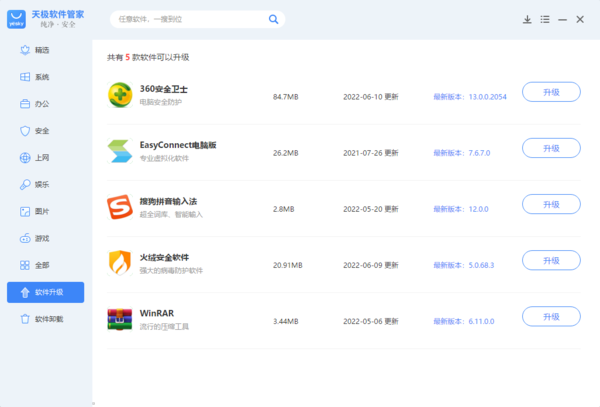 首先,要为大家推荐的第一款PC电脑上好用的软件管家工具为天极软件管家,相信如果你看过小编之前为大家介绍过的文章,那么你对天极软件管家这款工具一定不陌生,因为它是一款非常简单、实用的软件管理工具,不管是对电脑上的软件进行升级,还是卸载,它都能够满足你。更重要的是,我们可以直接下载天极软件管家软件来管理电脑上的软件,毕竟我们要使用腾讯软件管家或者是360软件管家的时候,我们都需要下载与之对应的腾讯电脑管家或360安全卫士,才能够使用他们的软件管家软件。