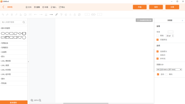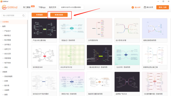 GitMind软件中是有流程图制作功能的,打开GitMind后,在上方就可以看到“新建流程图”的选项,点击后就可以进入到流程图的制作编辑界面,在这里我们可以添加流程图中所需要的元素,并把文字内容也都整理完成,就可以点击右上角的“保存”来存放在电脑中了。当然,GitMind中也有相应的流程图模板,可以在模板中找到自己需要的类型,点击模板就可以进入修改里面的内容了。