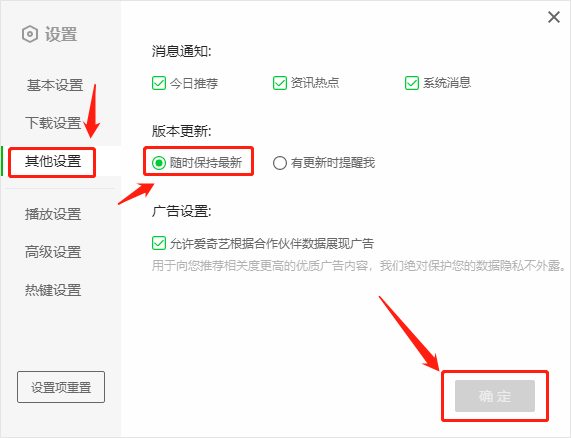 进入到设置界面后,在左侧点击“其他设置”,接着在版本更新这一栏选中“随时保持最新”,然后点击下面的“确定”,这样我们的爱奇艺客户端有新版本时就会自动更新,无需我们再手动更新版本了。