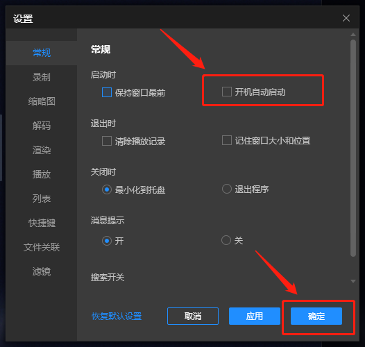 进入到设置选项中,来到“常规”一项,接着取消勾选上方的“开机自动取消”一项,然后点击下面的“确定”或是“应用”,就修改完成了。下一次再打开电脑时,恒星播放器就不会自动启动了。