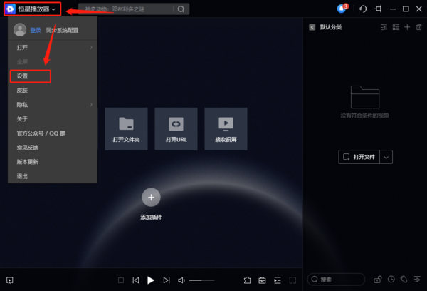 首先打开恒星播放器,在软件的左上角点击“恒星播放器”字样的选项,接着在下方出现的菜单中选择“设置”。