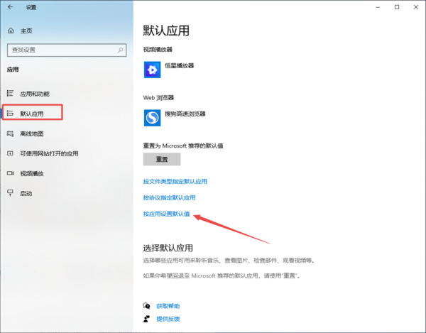 1、还是进入到电脑的默认应用设置界面中,然后在右侧的【重置为Microsoft推荐的默认值】选项下方,选择【按应用设置默认值】选项。
