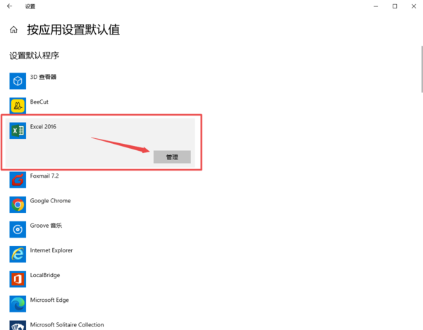 2、然后就会进入到【按应用设置默认值】的界面当中,此时我们找到微软office应用,比如excel,然后点击它,接着点击【管理】按钮。