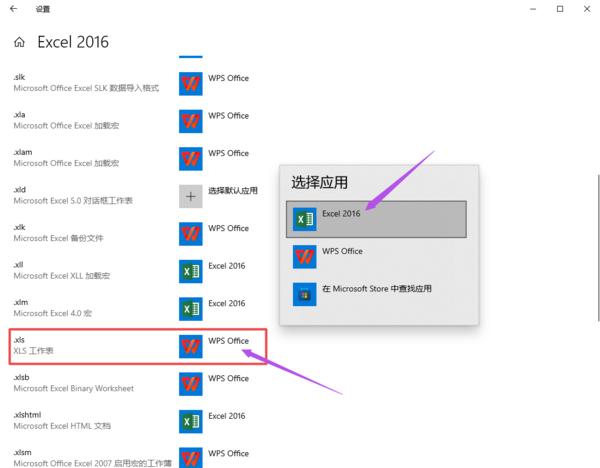3、最后,我们在弹出的界面中,根据自己的实际需用需求,来按照微软office的excel应用文件的各种类型,来设置它的默认打开应用为微软office即可。