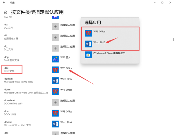 5、然后就会进入到【按文件类型指定默认应用】界面当中,此时我们找到想要设置微软office为默认打开方式的应用的文件类型,比如【doc】,接着点击其右侧的默认应用选项,然后在弹出的选项中,选择【微软office的word】即可。