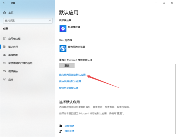4、接着将右侧的界面向下滑动,然后找到【重置为Microsoft推荐的默认值】选项下方,此时就是我们两种设置默认应用打开方式方法的分水岭了。这里点击【按文件类型指定默认应用】选项。