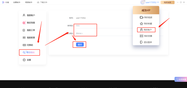 在右糖修改自己账号的登录密码方法也是十分的简单,仍然是先登录到软件中,之后点击用户名位置,在出现的选项中选择“我的账户”,在左侧导航栏中点击“修改密码”,接着在右侧输入需要修改的密码,确认密码后,单击下面的“提交”,密码就修改完成了。