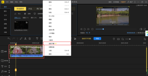 4、视频文件添加到视频轨道当中后,选中视频轨道中的文件,然后按下鼠标右键,在弹出的选项中选择【提取字幕】功能。