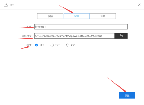 11、然后在弹出的导出窗口中,选择顶部的【字幕】选项,再接着设置好字幕的名称、输入目录和格式,最后点击【确定】按钮。