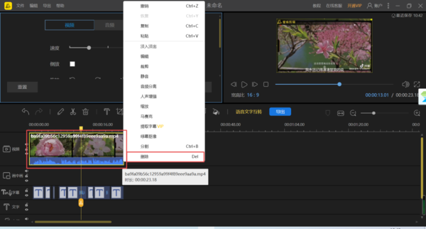 9、接着我们选中视频轨道中的视频,然后按下鼠标右键,接着选择【删除】选项。