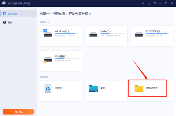 打开傲软数据恢复后,我们在主界面可以看到上方是我们电脑中的各个磁盘,下面是回收站等位置,在这里我们选择下面右侧的“选择文件夹”。