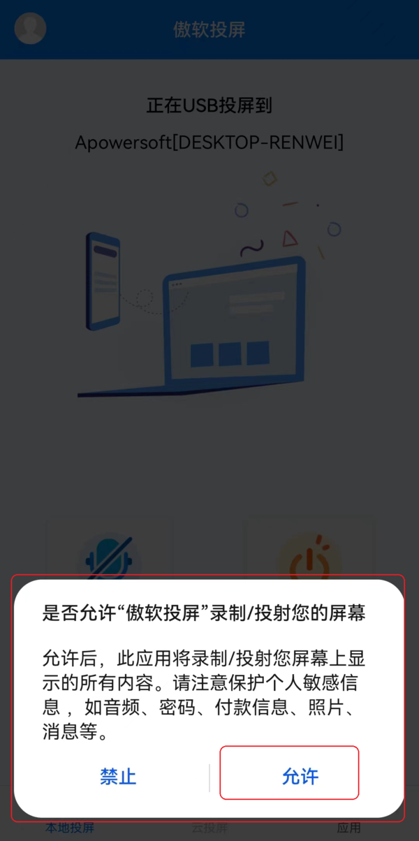 7、紧接着,回到手机端的傲软投屏软件界面上,然后还会弹出一个【是否允许“傲软投屏”录制/投射您的屏幕】的弹窗提示信息,点击【允许】选项。