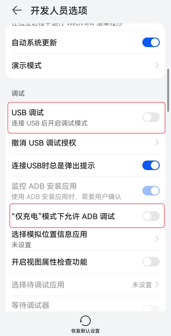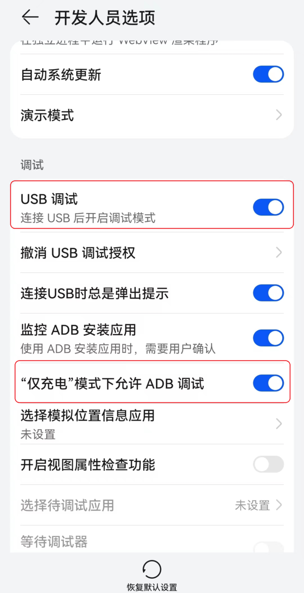5、然后我们在弹出的开发人员选项窗口中,找到【USB调试】功能和【“仅充电”模式下允许ADB调试】功能,然后将这两个功能右侧的开关滑动打开。