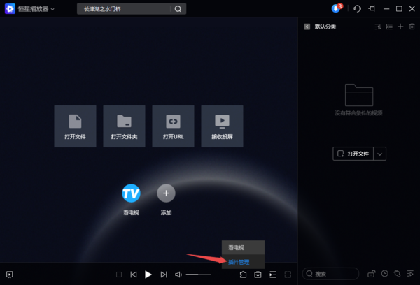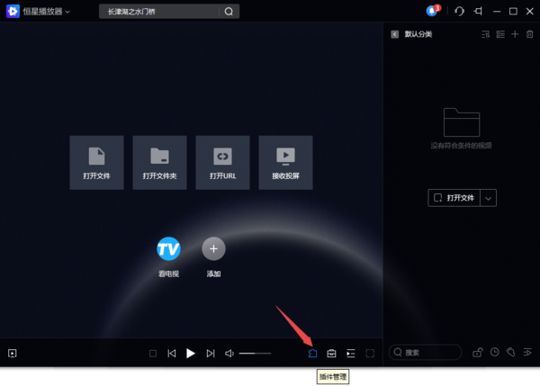 1、启动电脑上的PC版恒星播放器软件,然后找到界面底部靠右位置的【插件管理】按钮,并点击它。