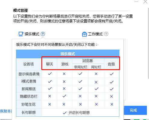 跳转到设置页面之后,在左侧选择“模式”项,就能对娱乐和工作模式,进行自定义选择设置项的开启和关闭了。