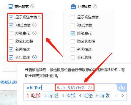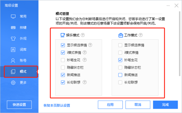 虽然只要使用电脑就必须用到输入法,但不同的场合使用的词汇也会不一样。为了让输入法更切合不同的使用场景,百度输入法开发推出了娱乐和工作两种模式,可以提供不同设置项,让输入内容更智能。