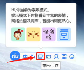 将电脑输入法切换为百度输入法之后,直接点击输入法状态栏中的模式图标,就能完成百度输入法的模式切换。这里要注意的是,工作模式是一个文件包图标,娱乐模式是一个茶杯图标。