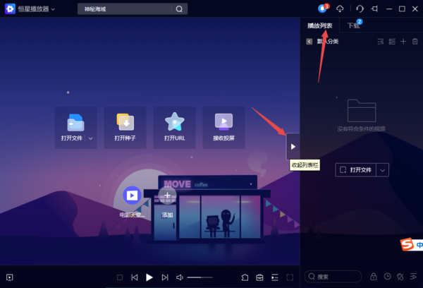 1、启动PC版恒星播放器,接着我们就可以看到软件主界面右侧的【播放列表】正在显示了,而想要关掉这个播放列表也是非常容易和简单的,我们直接将鼠标的光标放在播放界面和播放列表的交接处,此时界面上就会出现一个小三角箭头【收起列表栏】的图标。