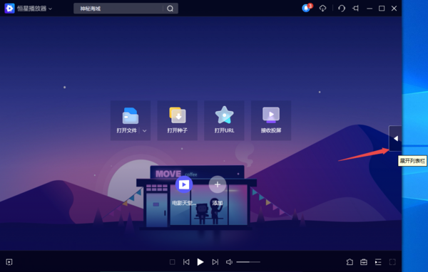 3、而想要再次展开播放列表的话,直接将鼠标的光标放在播放列表的最右侧中间,点击【展开列表栏】的小三角箭头图标,就可以展开恒星播放器的播放列表了。