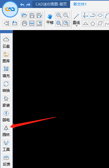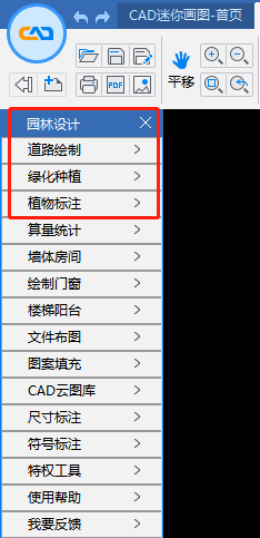 我们在打开CAD迷你画图,进入设计图创建界面后,可以在左侧的功能栏中看到【园林】按钮,我们点击后即可将功能栏转换成CAD迷你画图园林设计区。