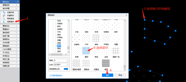 画完轮廓后,我们选中轮廓,接着点击左侧功能栏的【地被填充】,在地被填充界面里找到并点选【草坪】,接着点击地被填充界面的【确定】。