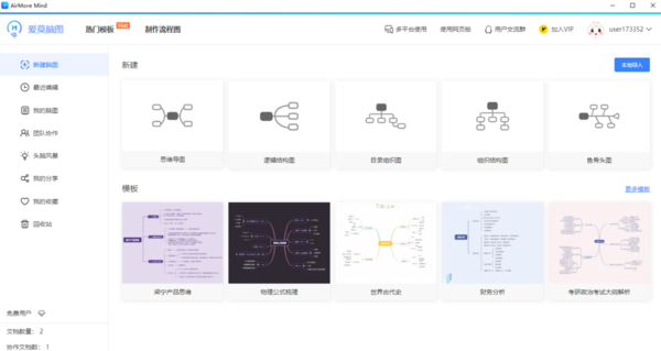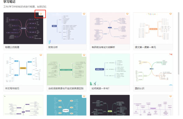 我们在登录到爱莫脑图后可以发现,这里面使用一些现成模板的话是要收费的,但是也并不是所有的模板都收费,这些在缩略图的右上角带有一个钻石样式标识的就是会员才可以用的模板。