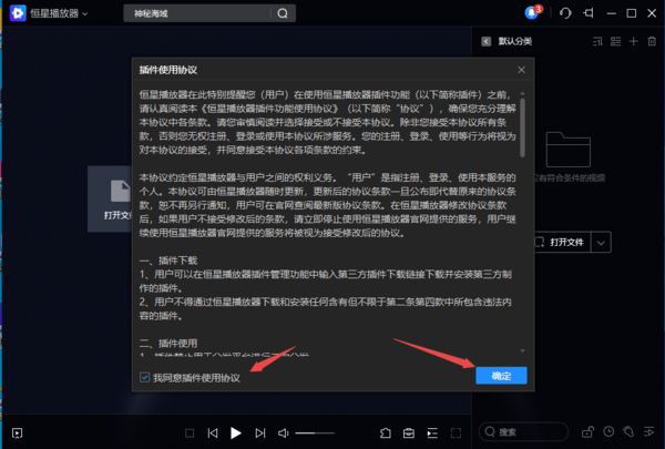 2、接着软件会弹出插件的使用协议,我们进行相关选项的勾选,软件点击右下角的【确定】按钮。