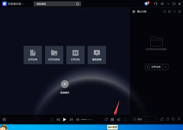 1、启动电脑上的PC版恒星播放器软件,进入到软件的主界面当中后,然后点击界面底部中间靠右位置的【插件管理】图标。