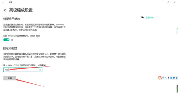 6.接着在高级缩放设置界面的底部的【输入100%-500%之间的自定义缩放大小(不建议)】的输入框中,输入自己想要调整的缩放大小,比如【105】,然后点击下方的【应用】按钮。
