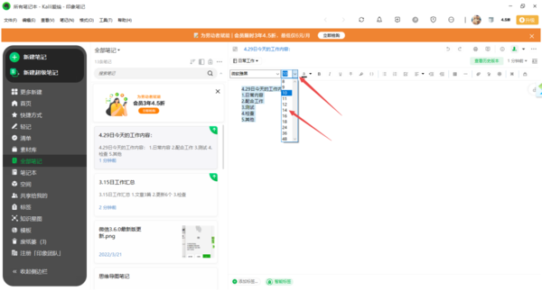 2、接着选中笔记内容中的所有文字,然后点击【10】右侧的下拉按钮,然后在弹出的选项中选择自己需要的大小,比如【14】。