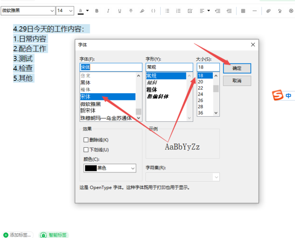3、接着软件就会弹出字体的设置窗口了,此时我们选择好笔记内容需要的字体和大小,然后点击【确定】按钮。当然了我们也可以直接选中好笔记内容后,按下键盘上的【Ctrl+D】快捷键来调出字体设置窗口。