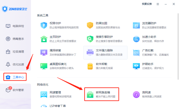 发现电脑中的网络无法正常连接时,可以打开2345安全卫士,然后在左侧找到“工具中心”,点击进入后在右侧的软件列表中,点击“断网急救箱”。
