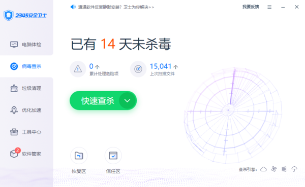 首先打开2345安全卫士,在左侧的导航栏中选择进入“病毒查杀”界面,接着在右侧出现的选项中点击“快速查杀”,这时会对我们的电脑进行查杀,如果出现了危险项,点击清理危险项清除掉了就可以了,之后我们的电脑中就不会有软件静默安装的情况出现了。