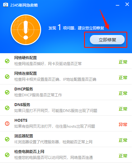 待诊断完毕发现问题后,再单击“立即修复”,修复完毕后,就可以正常的上网了。