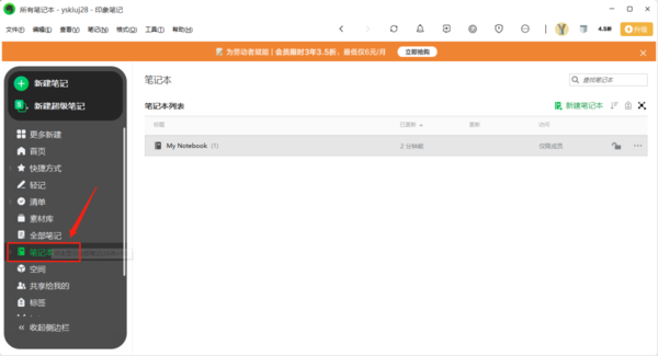 打开印象笔记之后在左侧导航栏中点击“笔记本”。