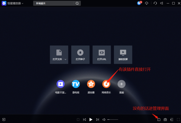 这时,我们需要借助插件的力量,需要使用【网络音乐】插件,如果有的话直接打开即可;没有的话,我们点击右下角【插件管理】按钮。