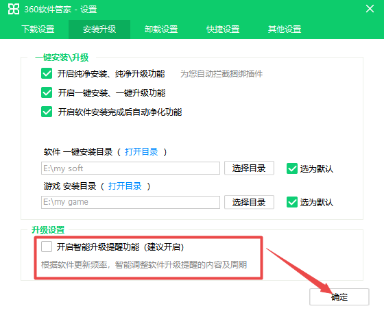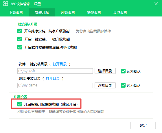 4、此时我们将【开启智能升级提醒功能】选项进行取消勾选,然后点击界面右下角的【确定】按钮,就可以成功的关闭360软件管家的软件升级提醒了。