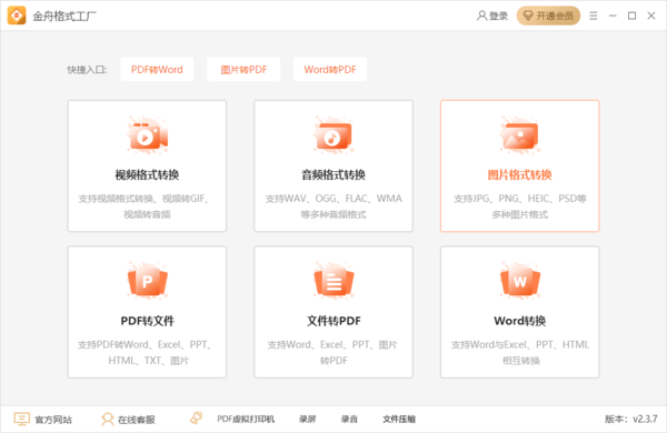 金舟格式工厂是一款多功能的格式转换工具,支持图片、视频、音频以及文档等多种内容的格式转换,并且还可以文件批量处理。金舟格式工厂的界面简洁,功能也十分简单易上手。