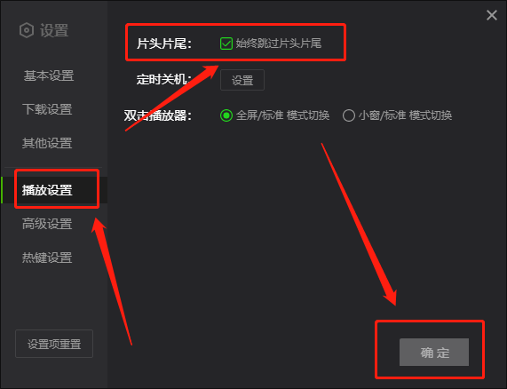 在“设置”界面的左侧选择“播放设置”模块,然后在出现的选项中勾选“始终跳过片头片尾”,最后点击下方的“确定”。