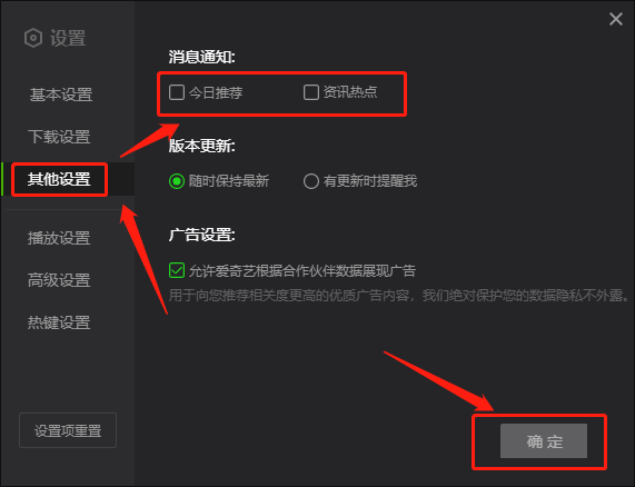 关闭爱奇艺的今日推荐还是要在“设置”中来关闭的,首先打开“设置”界面,然后在“其他设置”中将消息通知里的“今提推荐”和“咨询热点”取消勾选,最后点击下方的“确定”就可以了。