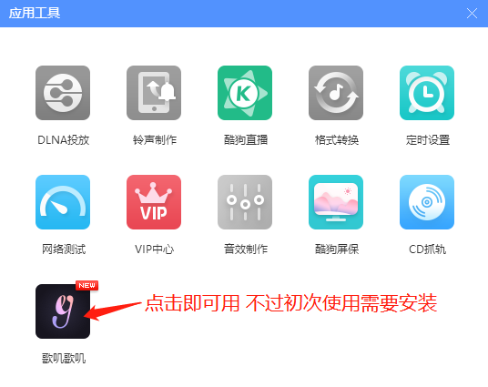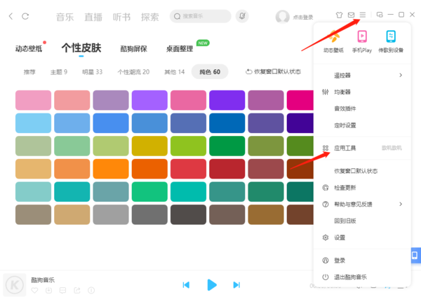 首先,我们需要找到酷狗音乐歌叽歌叽,来到主界面后,点击右上角的【三道杠】,召唤出扩展功能栏,在其中我们可以看到【应用工具】,点击后弹出小应用框。