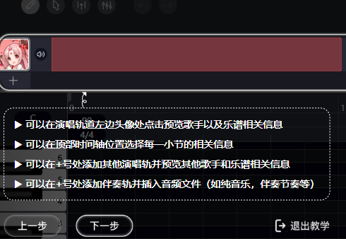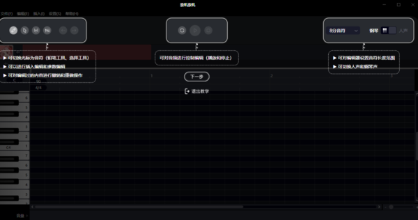 1、上方的按钮,左侧主要是选择工具、编辑以及撤销编辑;中间是控制音频的播放与停止;右侧则是控制音符长度范围以及音色(人声或钢琴声)。