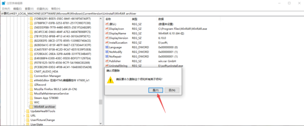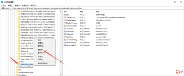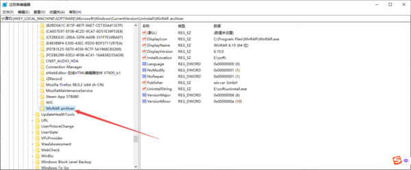 6、最后,【WinRAR】这个软件的安装名称不在左侧的Uninstall选项下,我们关闭注册表。