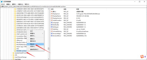 8、当然了,如果你以后怕卸载这个软件出问题的话,我们可以现在【WinRAR】软件的选项下按下鼠标右键,然后选择【导出】选项,接着将这个注册表文件进行保存备份。